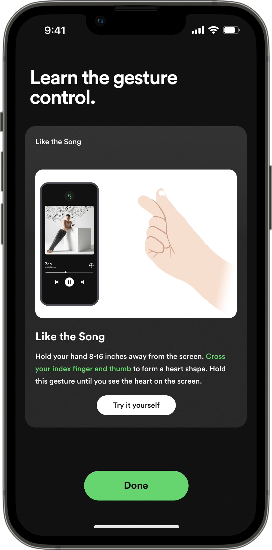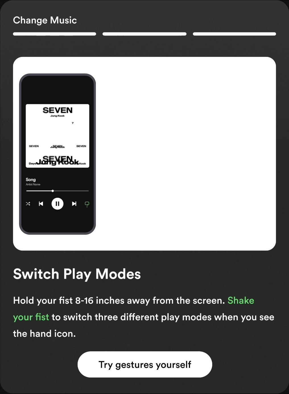 Upon logging in, users are directed to a specialized gestural control interface within the Spotify app, where an onboarding process helps them swiftly learn and adapt to the new gestural commands.