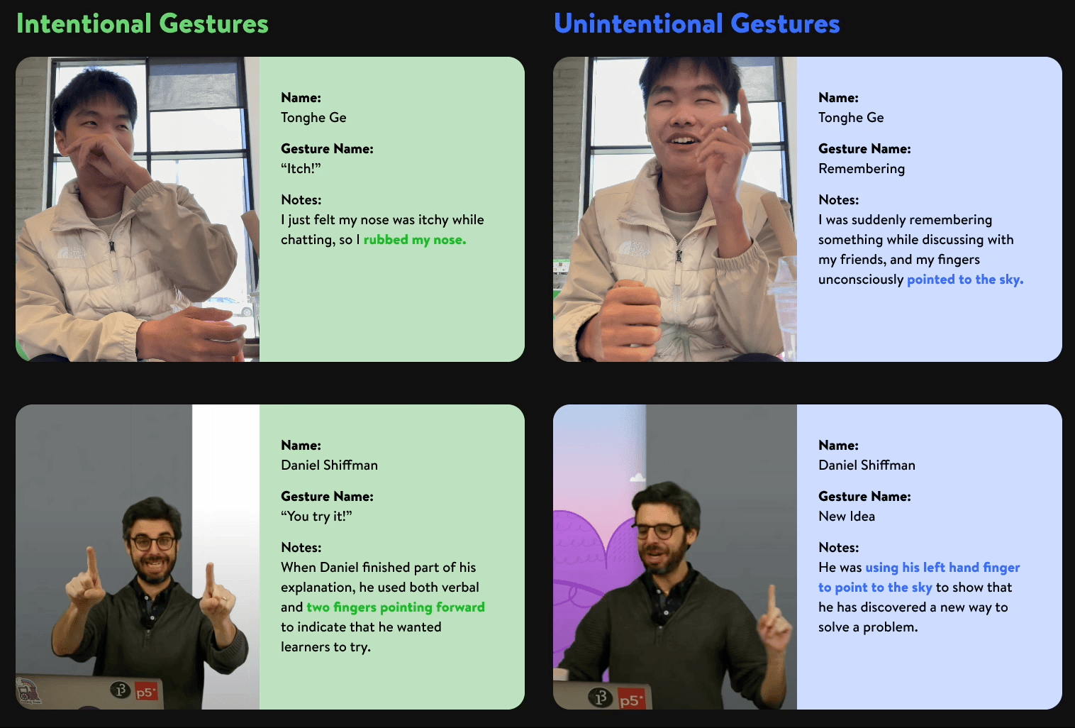 To enhance user experience, analyzing both intentional and unintentional gestures is crucial. Studying gestures recorded from my conversations and Daniel Schiffman's "Coding Train" lectures revealed their varied meanings and essential roles in enhancing communication.