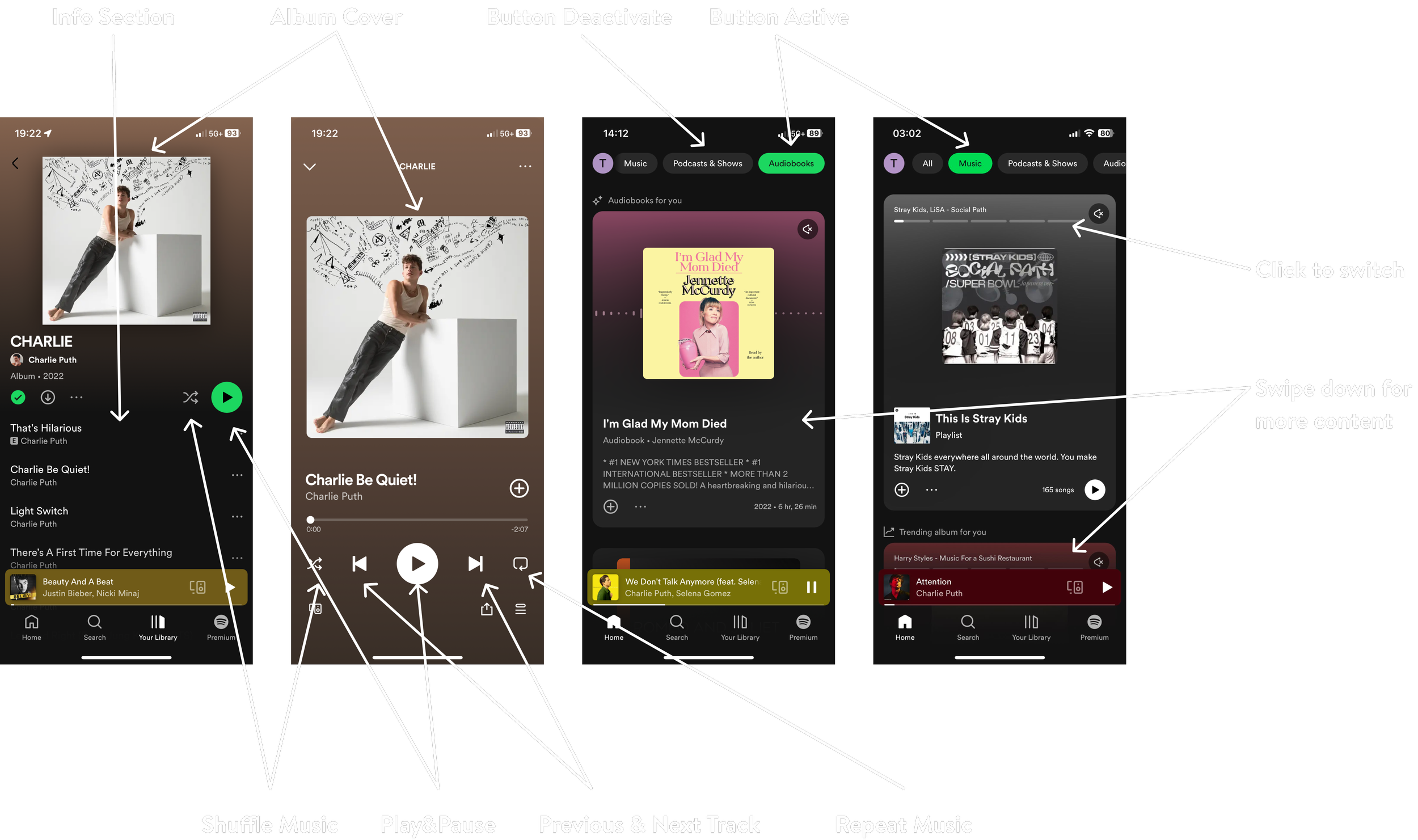 After thoroughly analyzing Spotify's UI Pattern, I drew inspiration from its original UI pattern, which is well-known to most Spotify users, to craft the final onboarding section, ensuring a smooth, seamless, and cohesive implementation of gesture onboarding and other UI elements.