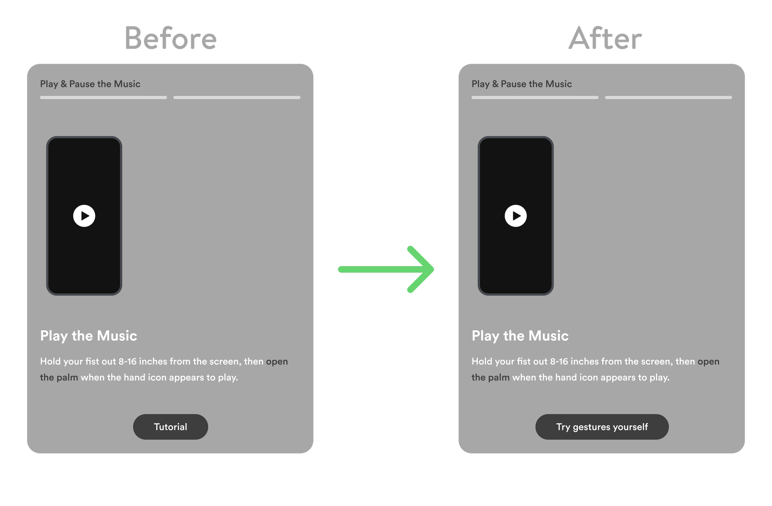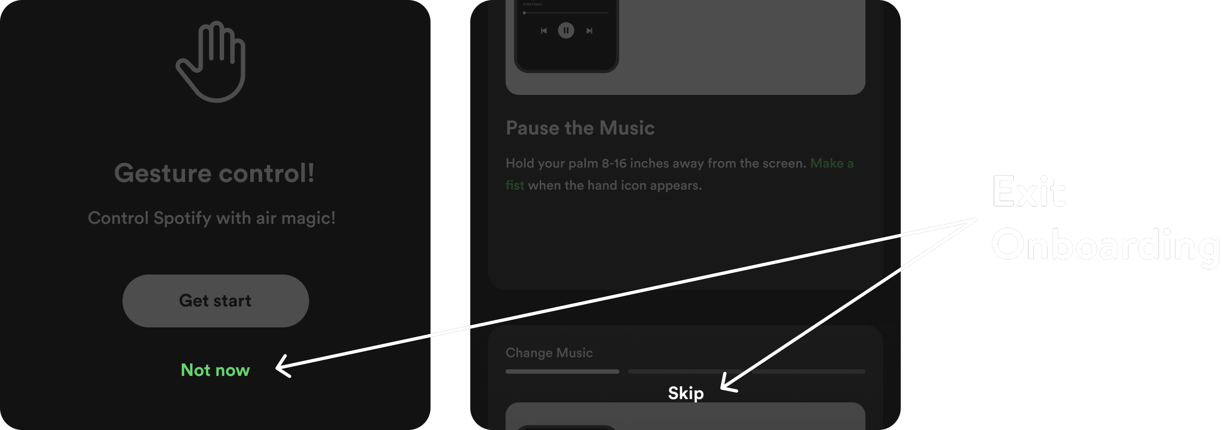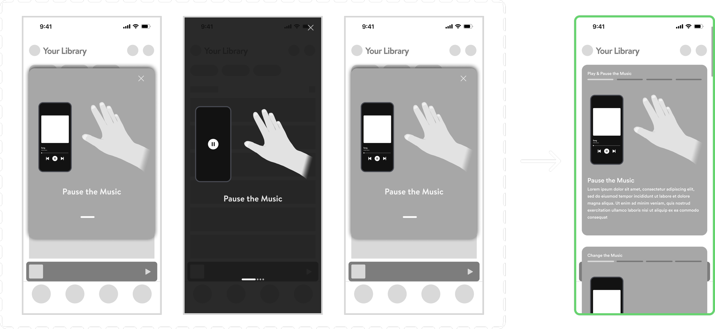 💡 Incorporating numerous gestures into the onboarding process posed a challenge in achieving a seamless integration without disrupting the platform's existing design language. My preliminary attempts at various UI solutions seemed to clash with the established pattern of Spotify.
