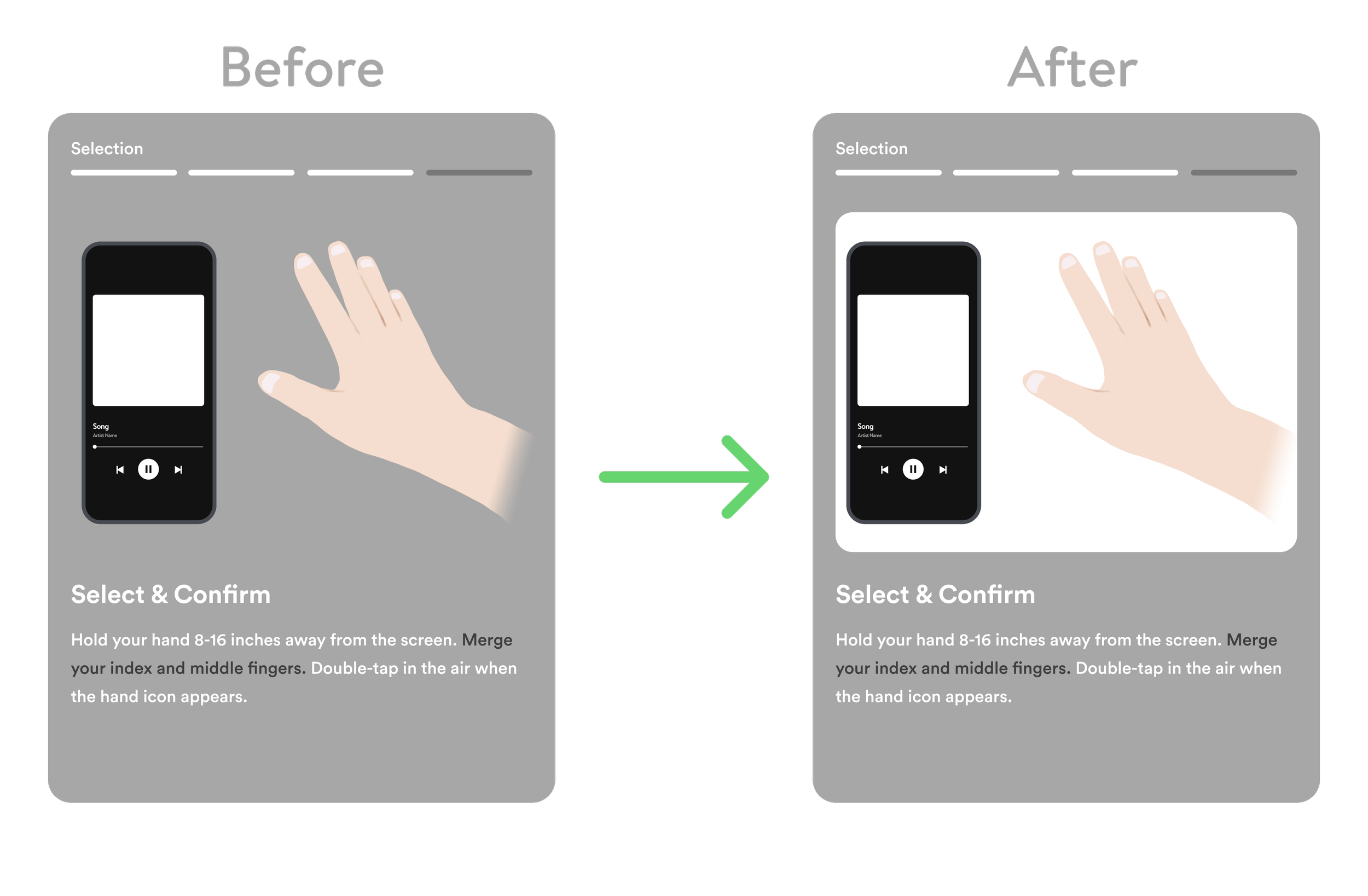 In refining gesture controls, I experimented with real hand photography, icons, and sketch animations to clarify and test different representations. User feedback highlighted a preference for sketch-style and iconographic animations, which facilitated easier gesture mimicry and learning, though real hand imagery proved less favorable.